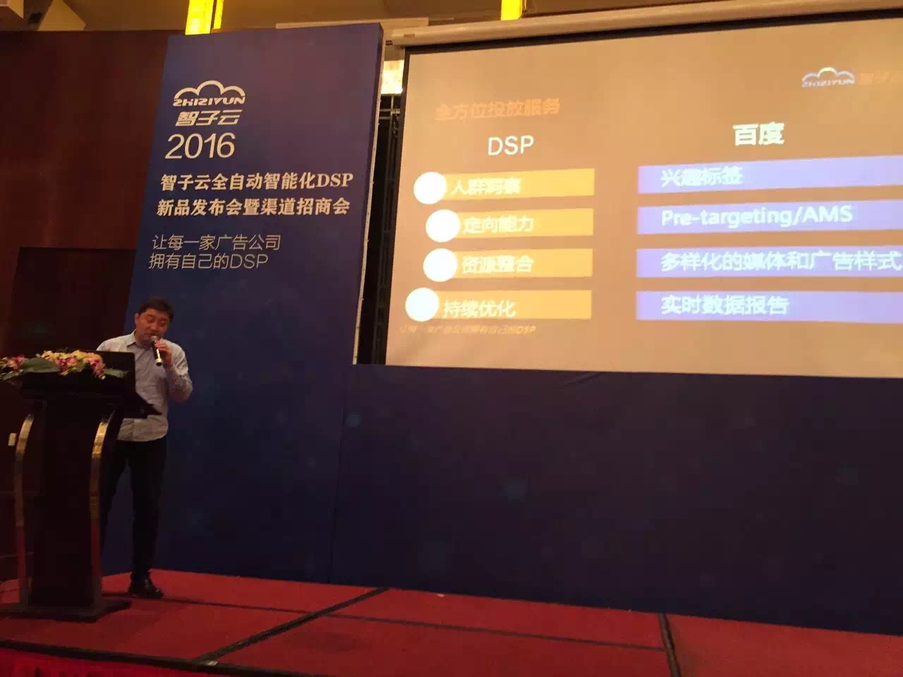 4月22日,智子云全自动智能化DSP新品发布暨渠道招商会在上海复旦皇冠假日酒店成功举办。智子云CEO朱建秋博士携公司核心团队发布了全自动智能化新一代DSP,同时邀请了合作伙伴百度、RTBChina、广州图灵科技、上海曼朗策划共同探讨大数据营销时代的程序化营销行业机会与DSP市场洞察。