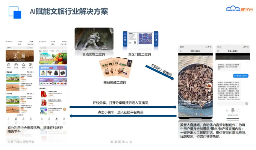 通过『SingerMind歌者数智人平台』,在每个旅游资源(景点、宾馆、土特产等)背后加上大语言模型机器人,利用AI自动生成直播视频和短视频,组织和讲好自己的故事,通过自然语言和机器人对话,规划旅游方案,产生再营销的新场景。