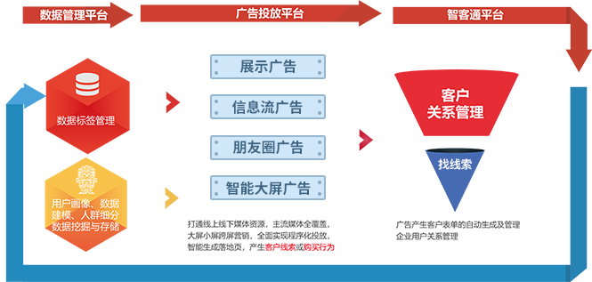从智能建站开始,到智投优选的广告投放、营销效果的监测、用户数据跟踪与分析,以及转化线索的追踪管理,形成了营销闭环,实现跨平台协同和自动优化,提升营销效率 。该平台集线上数据管理平台、程序化广告投放平台、智能大屏投放平台、智客通于一体。