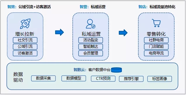 智子云的产品体系包括一个中台,三个前台。中台是将数据采集、数据处理、数据建模、数据利用等数据相关的功能和服务集成在一个平台上。三个前台依次是,公域引流的智效营销云,私域运营的智营SCRM系统,以及帮助企业快速线上化的智店社交电商平台。